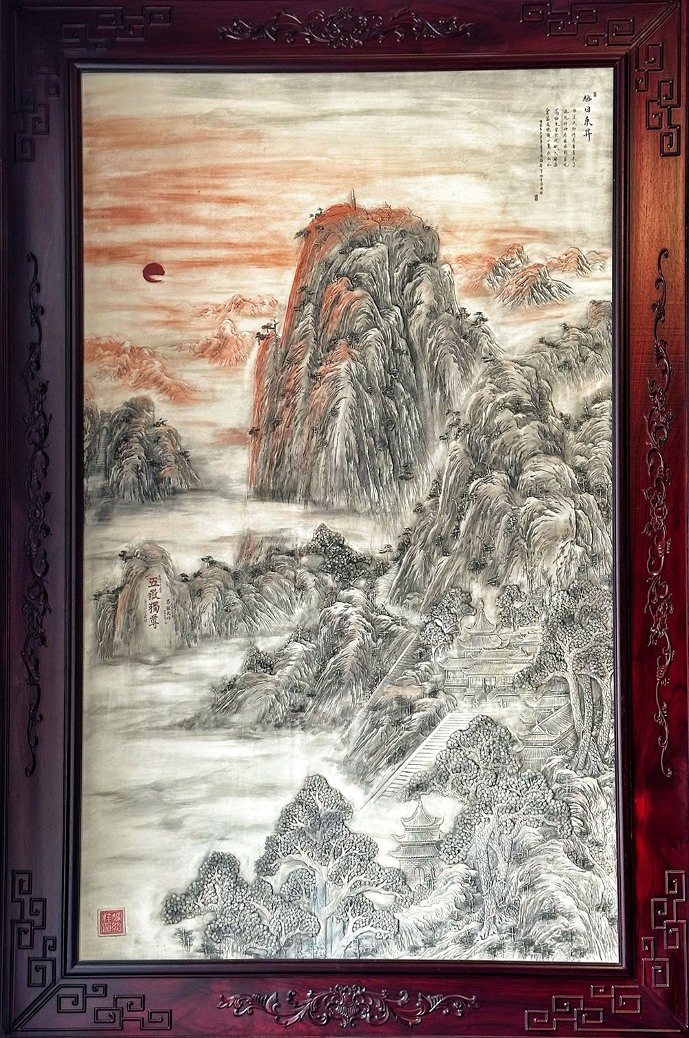 客戶定制 中式水墨山川落日陶瓷浮雕壁畫